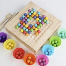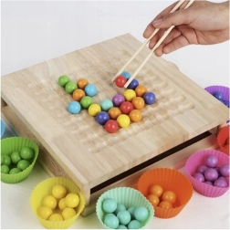 Delo s pinceto, palčkami in žličko pri manipulaciji s kroglicami podpira pravilen prijem, natančnost gibov in zbranost – idealen montessori pristop učenja skozi igro.