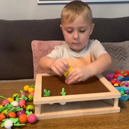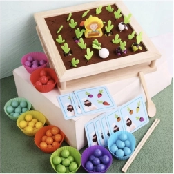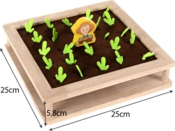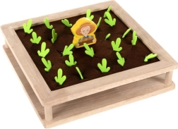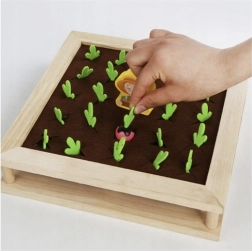 Ta lesena izobraževalna igra 2v1 povezuje prosto igro z učenjem. Otroci lahko »sadijo« in žanjejo filc kose zelenjave v vrtičku, razvrščajo in štejejo kroglice po barvah v sklede ali pa igrajo memory s tematskimi kartami. Robustna lesena deska je obojestranska – ena stran je namenjena vstavljanju kroglic in treningu prijema, druga ponuja kmečko spominsko igro in opazovanje.