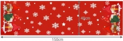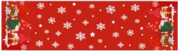 Rdeča podlaga z belimi snežinkami in zvezdami, na koncih dekor škratkov z darili – popoln dodatek praznični pogrnjeni mizi.