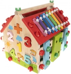 Vsaka stran hiške ponuja različne aktivnosti, ki spodbujajo otrokovo razvoj. Vključuje činele, vstavljanke oblik in udarno kladivce.