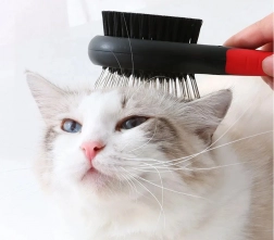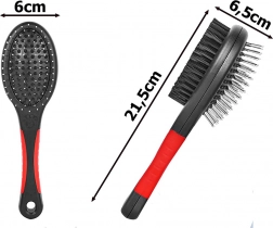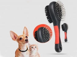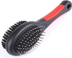 Dvostranska krtača je univerzalni pripomoček za redno nego dlake vašega ljubljenčka. Kovinski zatiči z zaobljenimi konci nežno razčesavajo vozle in pomagajo pri menjavi dlake, medtem ko goste najlonske ščetine odstranjujejo prah, zgladijo ter dlaki dodajo zdrav lesk. Primerna je za kratko, dolgo, valovito in grobo dlako.