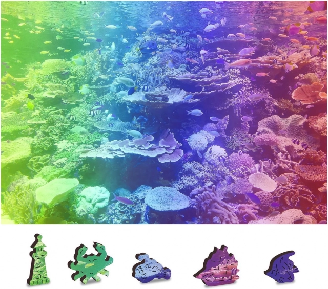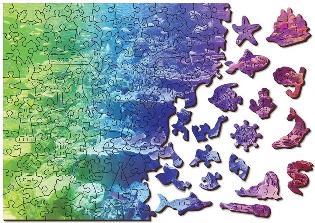 Lesene puzzle Koralni greben 2v1 prinašajo edinstveno izkušnjo sestavljanja – na eni strani sestavljate po barvnem motivu, na drugi pa po oblikah z ponavljajočim se vzorcem. Del koščkov ima izvirne oblike živali, predmetov ali zgradb, zaradi lasersko poudarjenih detajlov pa delujejo kot majhne samostojne figurice.
