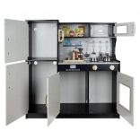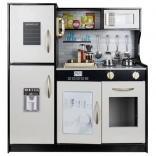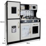 Elegantna lesena kuhinjica XL blagovne znamke KRUZZEL v kombinaciji črne, bele in zlate barve otrokom prinaša realistično igro kuhanja. Ponuja LED osvetlitev, zvočne učinke gorilnikov, premične elemente ter bogat priložen pribor (lonec, ponev, pokrovka, 4 žlice). Odstranljiv pomivalni korito, pečica, mikrovalovna pečica in shranjevalne omarice na “klik” spodbujajo kreativnost, učenje skozi igro in igranje vlog.