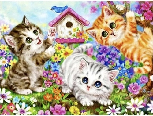 Ustvarite veselo sliko z motivom treh muckov v razcvetenem vrtu. Končano platno popestri otroško sobo, dnevno sobo ali delovni prostor.