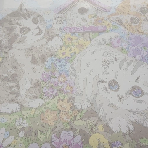 Oštevilčena polja na platnu ustrezajo lončkom z barvami. Različne velikosti čopičev pomagajo naslikati tudi fine detajle cvetlic in muckov.