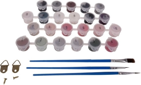 - Platno na lesenem okvirju, set akrilnih barv, 3 × čopič, vzorec/miniaturna slika, 2 × kljukica + vijaki, 2 × brezsledna kljukica