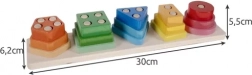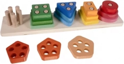 Natikanje koščkov preko ovir na zatičih otroke spodbuja k natančnemu rokovanju z oblikami – s tem krepijo prste, zbranost in koordinacijo oko–roka.