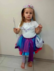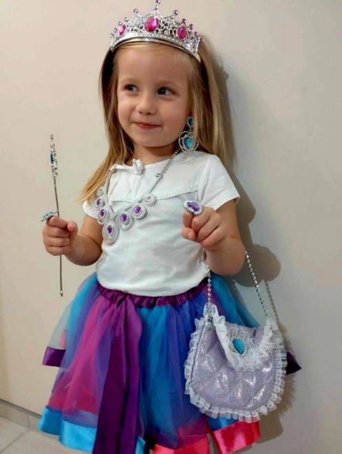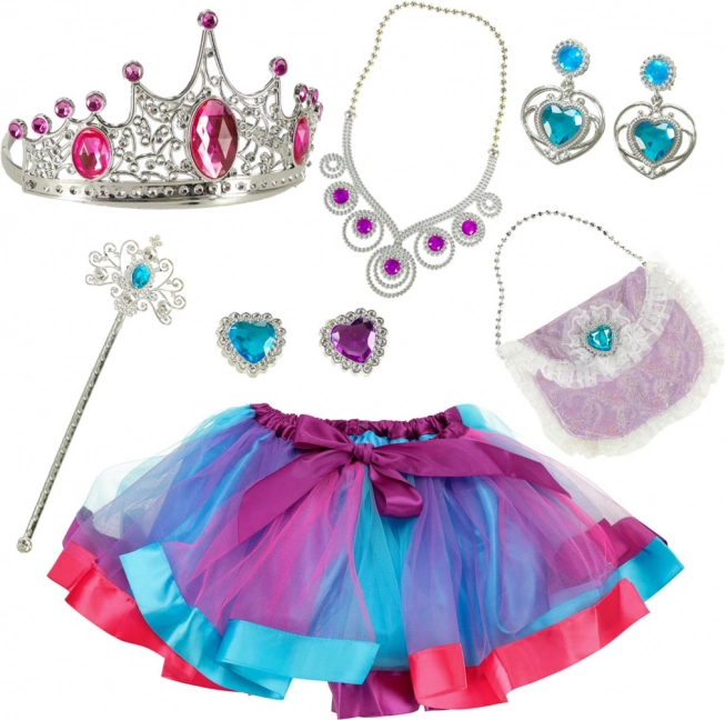 Čaroben 9-delni komplet v hipu spremeni vsakega otroka v pravo princeso. Pisano tutu krilce v tonih rožnate, vijoličaste in modre izstopa z nadihanim tilom in udobnim pasom. Elegantna tiare z rožnatimi kamni, bleščeč ogrlica in uhani poudarijo slovesen videz, medtem ko čarobna paličica in ljubka torbica zaokrožita celoten outfit.