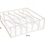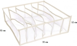 Ta tekstilni organizator pomaga učinkovito izkoristiti prostor v omari ali komodi. Zahvaljujoč 6 ločenim predelkom boste zlahka razvrstili spodnje perilo in dodatke, vse bo na svojem mestu in takoj pri roki. Nevtralna bela barva se poda v vsak dom.
