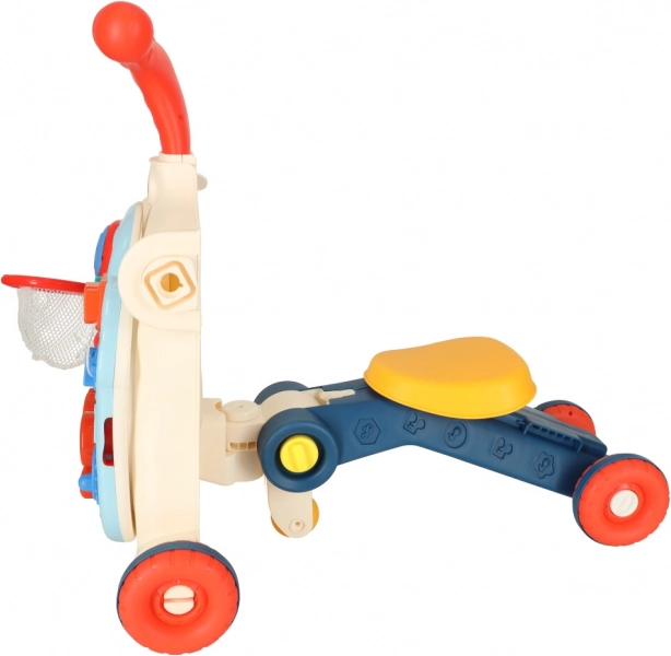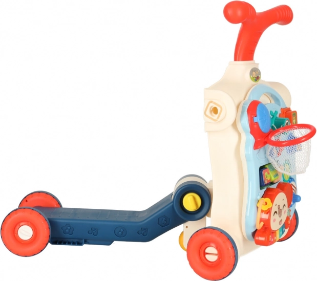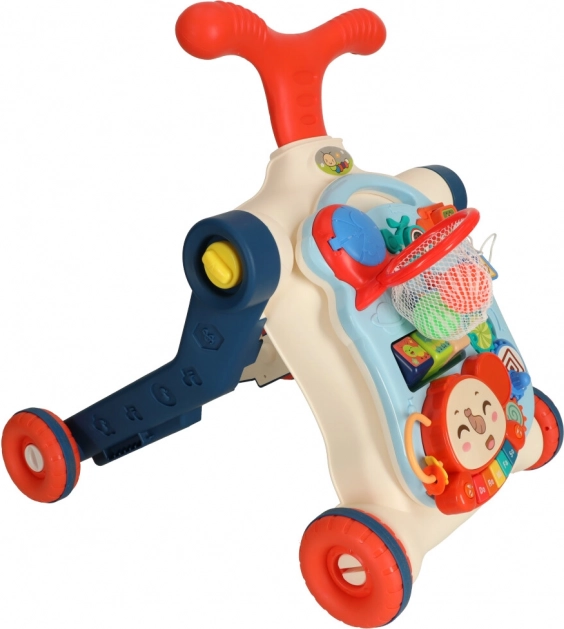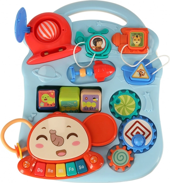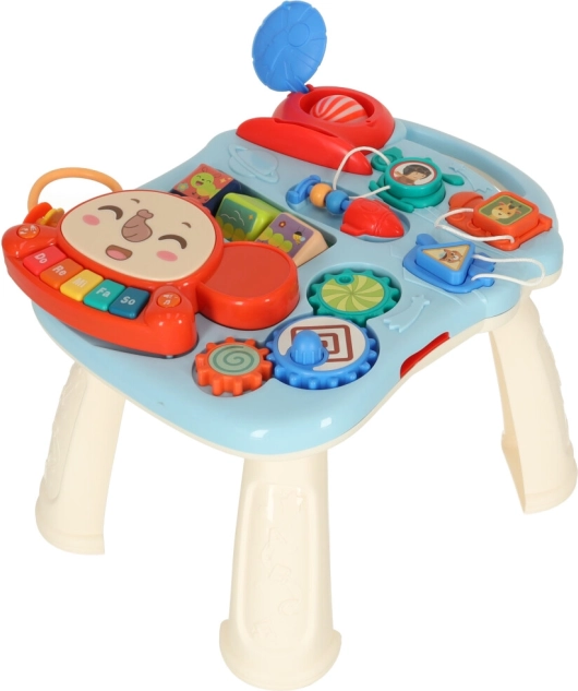 Izdelek je izdelan iz vzdržljive plastike in vsebuje raznovrstne interaktivne elemente, kot je klaviatura, plastična zobata kolesa, kocke in koš za žoge, ki podpirajo razvoj kognitivnih sposobnosti otroka.