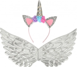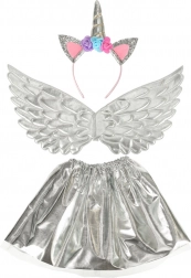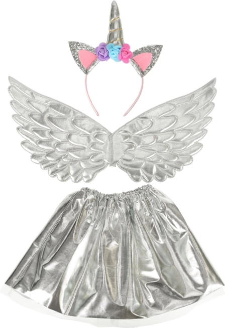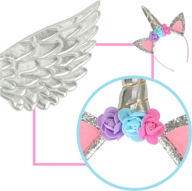 Ta čudovit kostum omogoča, da svojega otroka spremenite v edinstvenega samoroga. Sestavljen je iz srebrnega krila, elegantnih kril in natančno izdelanega naglavnega traku z rožicami. Idealen za vsako priložnost, ko si otrok lahko privošči pravljično igro.