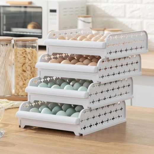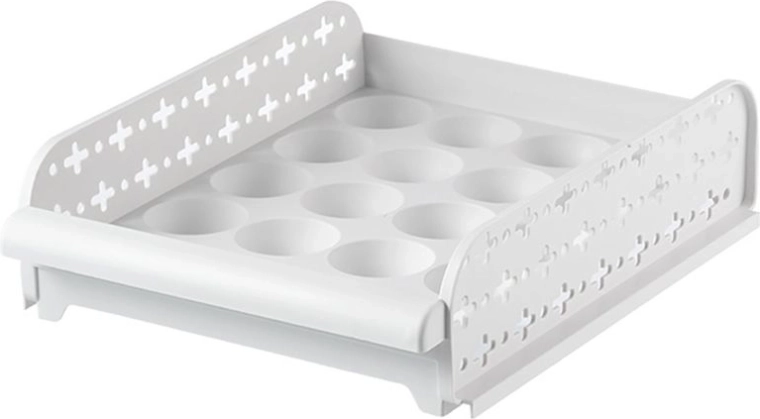 Praktična posoda za shranjevanje jajc z zadostnim prezračevanjem. Zabojnike je mogoče zlagati enega na drugega in jih premikati kot predale.