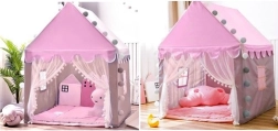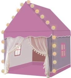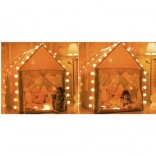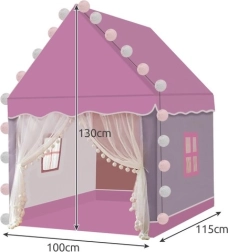 Čarobna otroška hišica za igro z nežnimi zavesicami in 2 okencema iz mrežice, dopolnjena z LED lučkami cotton balls (20 kosov, 3 m). Prostorne mere 130 × 100 × 120 cm, talna podloga v kompletu in enostavna montaža jo naredijo idealen prostor za domišljijske igre v otroški sobi in na terasi.