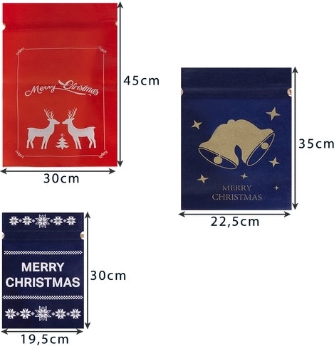 Elegantni set božičnih darilnih vrečk iz trpežne netkane tekstilije v barvah rdeča, zelena in temno modra. Darila enostavno zavijete brez škarij in lepilnega traku, vsaka vrečka ima praznični motiv in napis »Merry Christmas«. Tri praktične velikosti za drobne pozornosti in večje sete, večkratna uporaba ter stilna izvedba za čudovit božič brez nepotrebnih odpadkov.