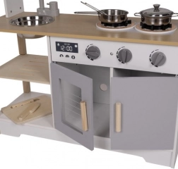 ANALOGNA URA + Zvoki - analogna ura je nameščena v višini otrokovih oči, kazalci so premični, zato se lahko otrok uči časa, gorilniki na kuhinji in v mikrovalovni pečici ob preklapljanju gumbov klikajo! Vaš otrok bo navdušen – kuhinja mu omogoča ure brezskrbne igre.