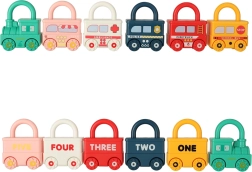 Vsako vozilo ima izrazito barvo in število koles za preprosto ujemanje z oštevilčenimi ključi. Otroci si naravno osvajajo barve, štetje in razvrščanje.