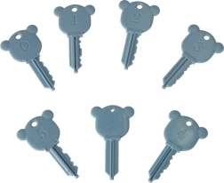 Z obojestransko grafiko si otroci urijo prepoznavanje vozil in osnovnih barv. Komplet je izdelan iz kakovostne plastike brez ostrih robov, zato je vzdržljiv in varen za vsakodnevno igro. V pakiranju najdete 6 vozil in 7 ključev, med katerimi en magični ključ odpre vse ključavnice.