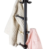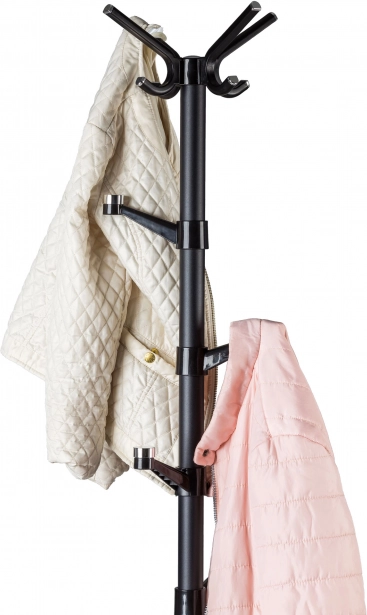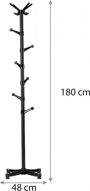 Šest nižje nameščenih rok olajša obešanje tudi manjšim uporabnikom, medtem ko zgornji del z dodatnimi kljukami nudi dovolj prostora za plašče, šale ali torbice. Štiri široko razkoračene noge zagotavljajo stabilnost tudi pri večji obremenitvi, gumijaste kapice pa ščitijo tla pred praskami.