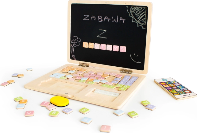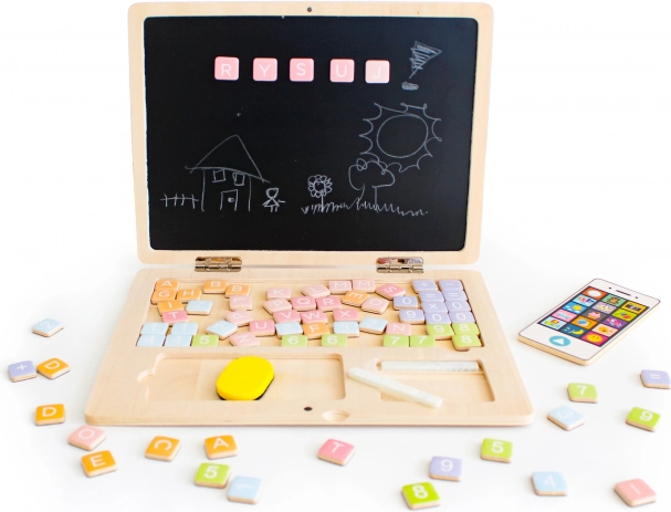 Privoščite otrokom učenje skozi igro z lesenim prenosnikom ECO TOYS. Zahvaljujoč kombinaciji magnetne “tipkovnice” in kredne table lahko sestavljajo besede, preproste naloge, rišejo in brišejo v nedogled. Močna lesena konstrukcija brez ostrih robov zagotavlja 100 % varno in vzdržljivo igračo.