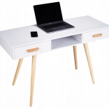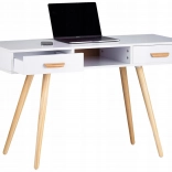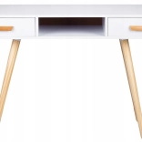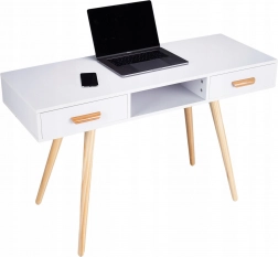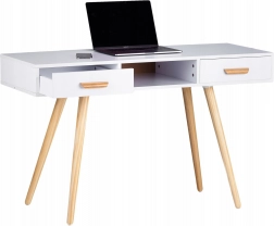 Odkrijte elegantno in funkcionalno mizo, ki je odlična za domačo pisarno, spalnico ali dnevno sobo. Kombinacija bele plošče in naravnih borovih nog ustvarja čist skandinavski videz, ki se zlahka poda tako modernemu kot klasičnemu interierju. Zaradi premišljanega shranjevalnega prostora boste imeli vse pri roki, delovna površina pa bo ostala pregledna.