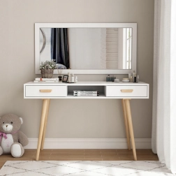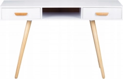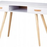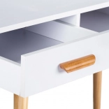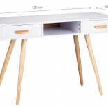 Laminirana plošča je odporna proti praskam in obarvanju, kar boste cenili pri vsakodnevni uporabi. Masivne borove noge zagotavljajo trdnost in stabilnost brez neželjenega premikanja. Dva prostorna predala in osrednja odprta niša sprejmeta kozmetiko, pisarniške potrebščine in drobne dodatke.