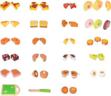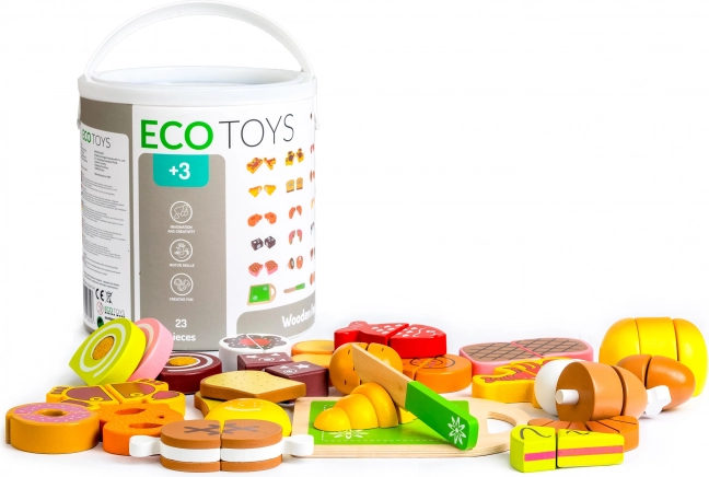 Ta čudovit komplet barvitih živil, znanih iz kuhinje, je odlično darilo za vsakogar. Vaš otrok bo spoznal priljubljena živila in s možnostjo rezanja in povezovanja krepil ročne spretnosti.