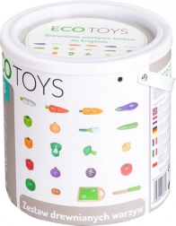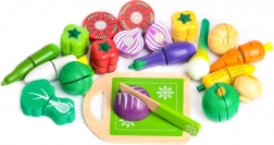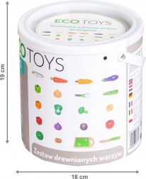 Garnitura je odličen dodatek za otroke, ki imajo igrače kuhinje, stojnice in trgovine. S temi lesenimi izdelki bo igra še bolj kreativna in bo zagotovo prinesla veliko veselja. Vsi elementi so izdelani iz lesa in prekriti z barvo, varno za otroke. Zelenjava je sestavljena iz dveh polovic, povezanih s suhim zadrgom, kar omogoča otrokom, da vidijo, kako izgledajo v prerezu. Vključena sta tudi lesena deska in nož.