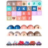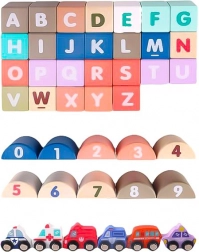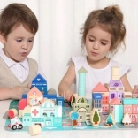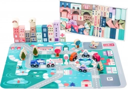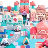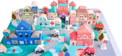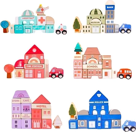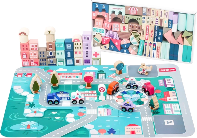 Lesene kocke za otroke starejše od 3 let so idealne za razvoj ročne spretnosti in prostorske predstave. Set vsebuje 115 elementov, ki vključujejo različne stavbe kot so hotel, bolnišnica, banka, policijska postaja, šola in gasilska postaja. Vsaka stavba je podrobno zasnovana in dopolnjena z ustreznim vozilom.