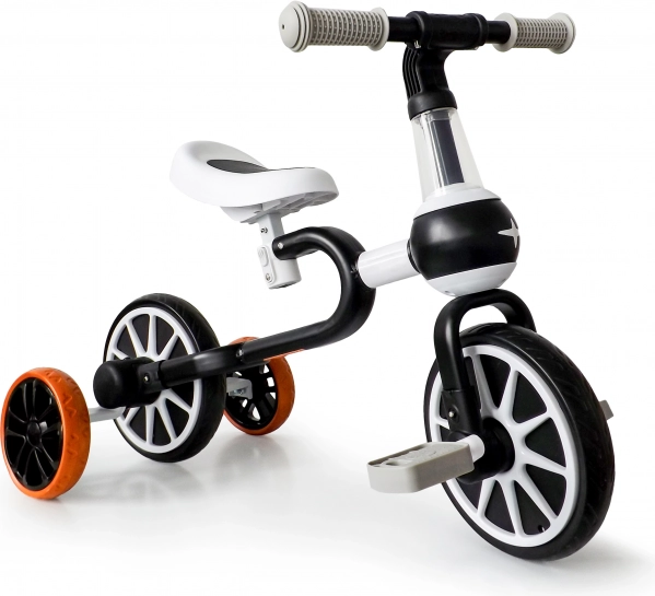 Kolo 4v1 se prilagaja sposobnostim otroka zahvaljujoč nastavljivi višini sedeža ter snemljivim pedalom in pomožnim kolesom.
