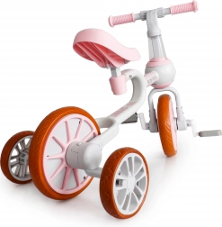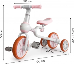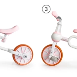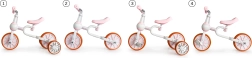 Zahvaljujoč nastavljivemu sedežu ter snemljivim pedalom in stranskim kolesom lahko poganjalec prilagodite potrebam vašega otroka. Otrok lahko začne s poganjalcem in postopoma preide k kolesarjenju s podporo, kar omogoča do štiri različne konfiguracije: