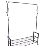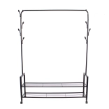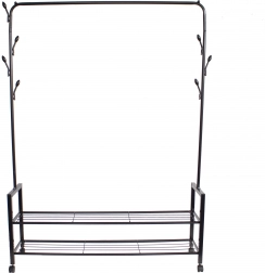 Obešalo ima vzdržljivo, stabilno kovinsko konstrukcijo s prašnim lakiranjem. Stranske dekorativne kljukice nudijo dodatno mesto za obešanje torbe, šala ali klobuka. Prostorni polici sta idealni za dodatke in obutev.