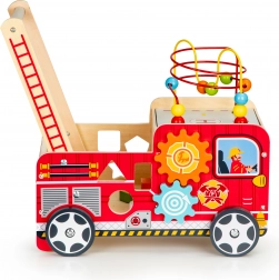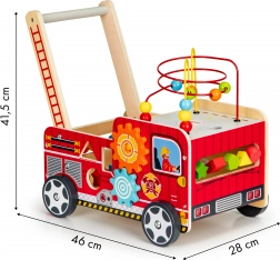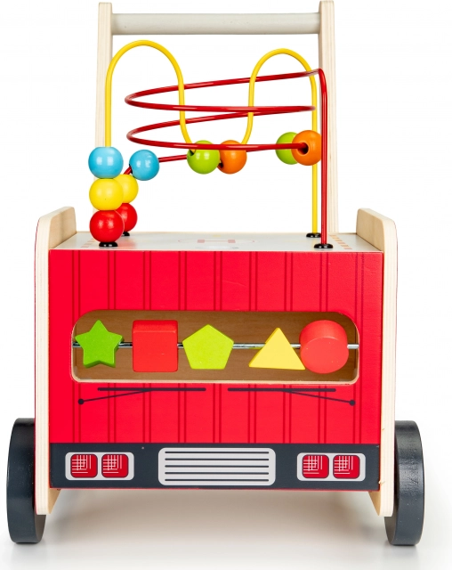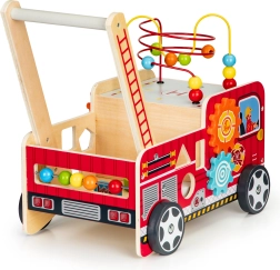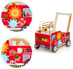 Lesena hojica v obliki gasilskega avta je idealen pomočnik za prve korake vašega otroka. Hojica je zasnovana tako, da zagotavlja stabilnost in hkrati zabavo s pomočjo različnih interaktivnih elementov kot so zobniki, labirinti z kroglicami in sortirnik oblik.