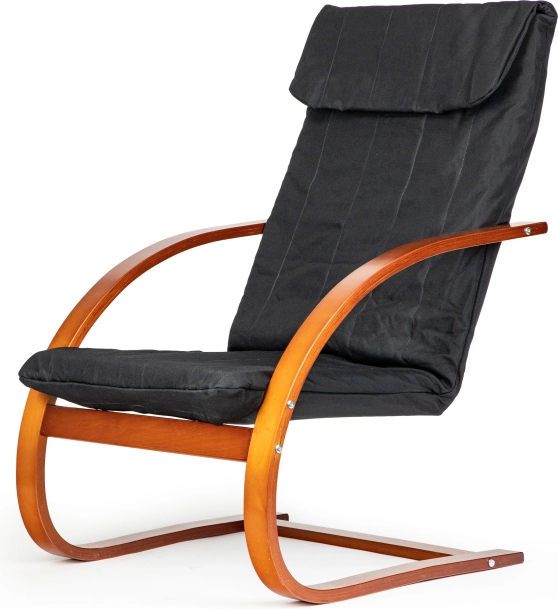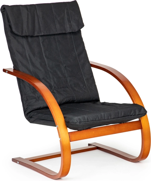 Uživajte v trenutkih počitka v stolu, ki združuje sodoben dizajn in ergonomijo. Gugajoči mehanizem pomirja in razbremeni hrbet, mehko oblazinjenje s penastim polnilom pa poskrbi za udobje pri branju, sproščanju ali gledanju televizije. Kontrast črne tkanine in orehovega lesa poudari značaj vsakega interierja.