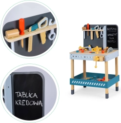 Organizacija in red: Delavnica ima veliko delovno površino in organizator za shranjevanje orodja, kar uči otroke ohranjati red v svojem delovnem okolju. Otrok si lahko zapisuje pomembne informacije na tablo za kredo, vgrajeno v delavnico.