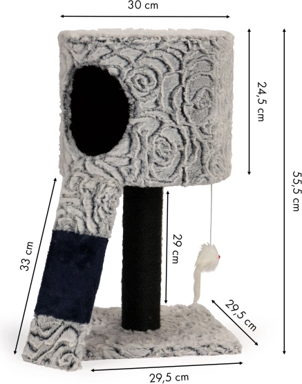 Vsaka ploščad je prekrita z mehkim plišom, kar zagotavlja odličen prostor za počitek in udobje. Vključuje tudi tri viseče pompone, ki spodbujajo igro in zagotavljajo zabavo vašega ljubljenčka. Zaradi stabilne konstrukcije je praskalnik stabilen in varen, kar je pomembno za njegovo stabilnost med igro.