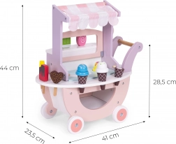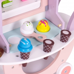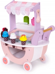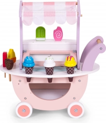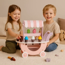 Privoščite otrokom ure ustvarjalne zabave s sladolednim stojem ECOTOYS. Zahvaljujoč premičnemu vozičku s strešico in bogatim dodatki se otroci zlahka vživijo v vlogo prodajalca in kupca. Lesena izdelava, zaobljeni robovi in nežne barve spodbujajo mirno in varno igro.