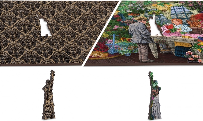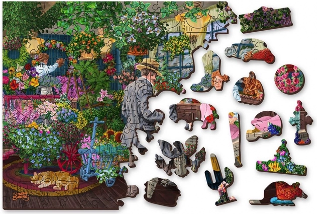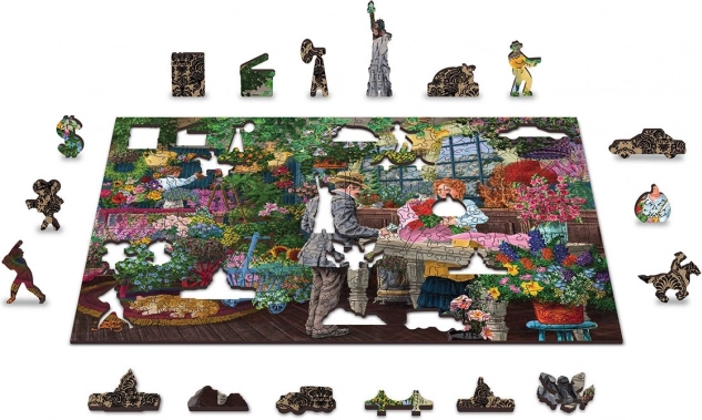 Stilna lesena sestavljanka z motivom živahne cvetličarne bo razveselila ljubitelje podrobnih ilustracij in zahtevnejših izzivov. Zaradi dvostranske izvedbe uživate v dveh sestavljankah v eni – spredaj barvita scena, polna cvetja, zadaj vzorec za sestavljanje po oblikah. Unikatni izrezi v obliki živali, likov in predmetov delujejo kot majhne figurice in dodajo sestavljanju novo dimenzijo.