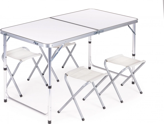 Lahka zložljiva miza in štirje vzdržljivi stolčki z jekleno konstrukcijo. Idealno za kampiranje, piknike, festivale in vrt.