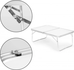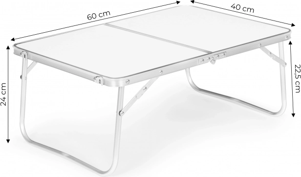 Miza se v hipu zloži v praktičen kovček z ročajem, zato se zlahka prilega v prtljažnik avtomobila ali doma v omaro. Plošča velikosti 60 × 40 cm nudi dovolj prostora za prigrizke ali igre, višina 24 cm pa udobno dopolni nizko kamp pohištvo.