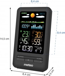 Z merjenjem temperature, tlaka in vlažnosti meteo postaja ocenjuje trend vremena za 12–24 ur s pomočjo razumljivih piktogramov. Natančna DCF ura se samodejno sinhronizira z atomskim časom, na voljo so datum, budilka s funkcijo snooze in indikator udobja notranjega okolja. Napajanje je možno iz omrežja (adapter v paketu) ali z baterijami.