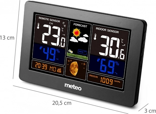 Ta vremenska postaja je opremljena s funkcijami za brezžično merjenje temperature v notranjosti in na prostem, prav tako tudi vlažnosti. Omogoča povezavo z WiFi aplikacijo, zato lahko podatke preverjate prek pametnega telefona z katerega koli mesta na svetu z dostopom do interneta. Poleg tega ima ure s samodejno sinhronizacijo časa in barometer.