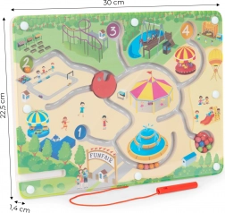 Ta barvita izobraževalna igrača prinaša otrokom svet atrakcij na eno samo ploščo. Z magnetnim svinčnikom majhne roke premikajo kroglice po varno zaprtih poteh, pri čemer se učijo potrpežljivosti, osredotočenosti in koordinacije oko–roka. Oštevilčeni in barvno označeni cilji otroke intuitivno vodijo k reševanju nalog.