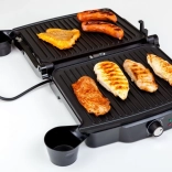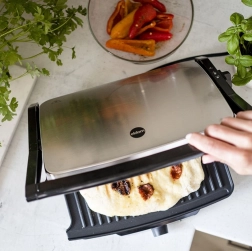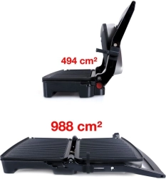 Zgornja plošča s plavajočim nosilcem se samodejno prilagodi različnim debelinam živil. Z nastavljivimi nogicami lahko spremenite naklon za učinkovit odvod maščobe v priloženi posodici. Praktične podrobnosti, kot so svetlobni indikatorji, zaklep pokrova za enostavno shranjevanje, prostor za kabel v podstavku in hladen ročaj, naredijo ta model odličnega pomočnika v vsaki kuhinji.