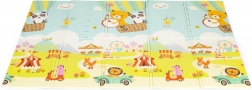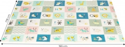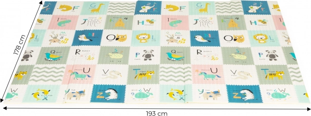 Dvostranski potisk prinaša dvojno mero zabave: na eni strani cirkus z živalmi, prevoznimi sredstvi in atrakcijami, na drugi strani abeceda in imena živali za učenje skozi igro. Podlogo zlahka zložite v kompakten paket in shranite v priloženo vrečko – idealno za dom, k babici ali na potovanja.