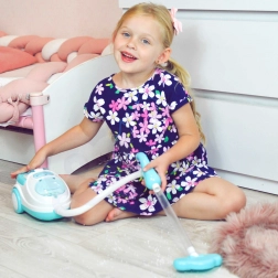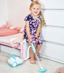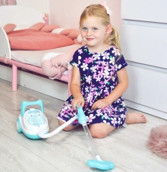 Ta modro-bel otroški sesalnik verno posnema pravi aparat – po vklopu sveti, oddaja realistične zvoke in zahvaljujoč funkciji sesanja posesa priložene polistirenske kroglice. Odličen je za igro vlog, spodbuja odgovornost in na igriv način uči otroke ohranjati red.