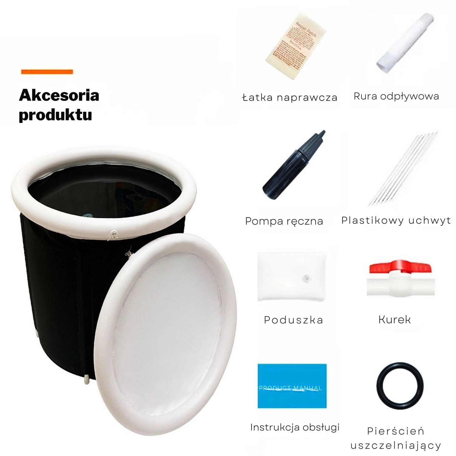 - popravni obliž, odtočna cev, ročna tlačilka, plastično držalo, blazinica, pipa, navodila za uporabo, tesnilni obroč