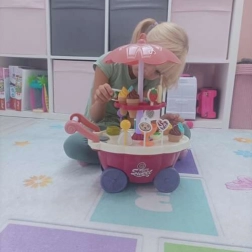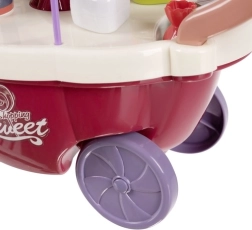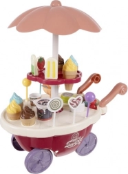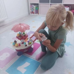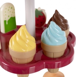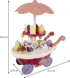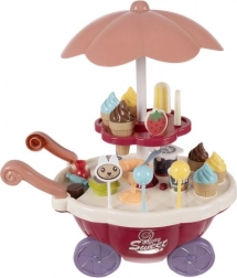 Privoščite otrokom lastno slaščičarno s sladoledom! Barvit voziček za sladoled z lučkami in melodijo ponuja veliko možnosti za igro prodajalca. V kompletu najdete kepice in sladoled na palčki, lizike, kozarec, žličko ter “kovance” za vajo plačevanja. Vrtljiv večnivojski stojalo (360°) lepo razstavi sladke dobrote.
