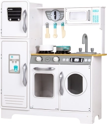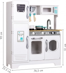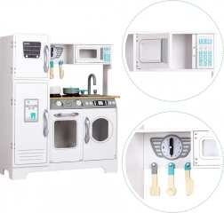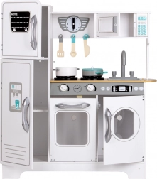 Odkrijte robustno belo kuhinjico ECOTOYS, ki vsak otroški prostor spremeni v malo kulinarično studio. Zahvaljujoč realističnim elementom – od vrtljivih gumbov z zvokom do odpirajočih se vratc in funkcionalnih shranjevalnih prostorov – bodo otroci doživeli pristno igro kuhanja, pečenja in pomivanja posode.