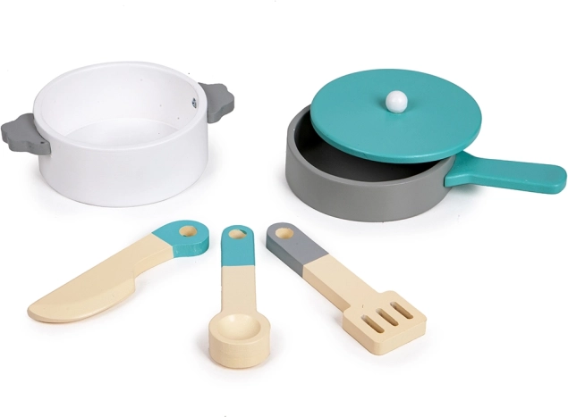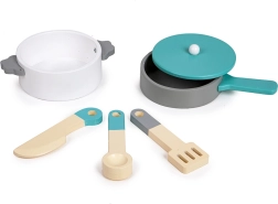 Vključuje »pralni stroj« za igro na gospodinjstvo in pet lesenih dodatkov: skodelica, ponev s pokrovko, žlica, lopatica in nož. Vse iz varno lakiranega lesa.