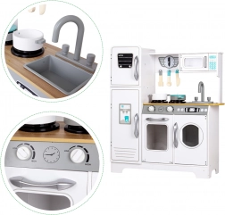 Kuhinijca je zasnovana z poudarkom na varnosti in detajlih. Lesena konstrukcija zagotavlja stabilnost, gladke robove in barve, varne za otroke. Vgrajene kljukice držijo kuhinjske pripomočke vedno pri roki, police v hladilniku in omarici pa ponujajo dovolj prostora za vse dodatke.